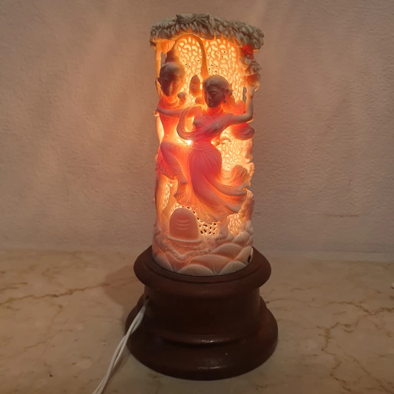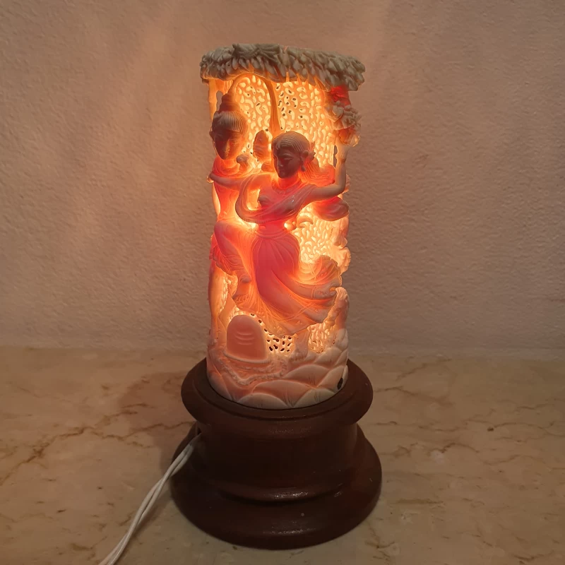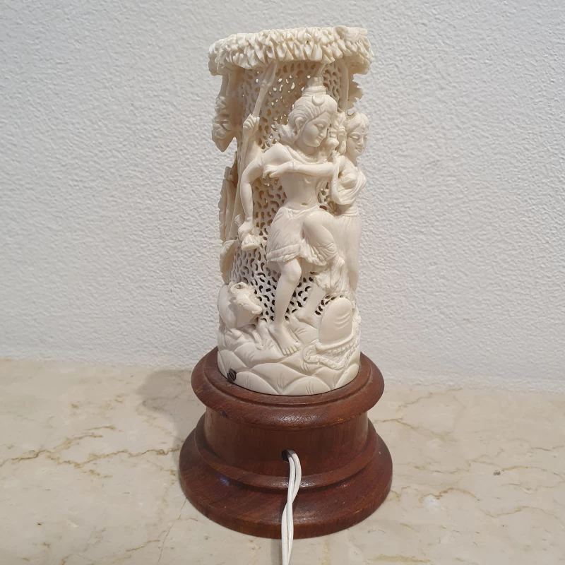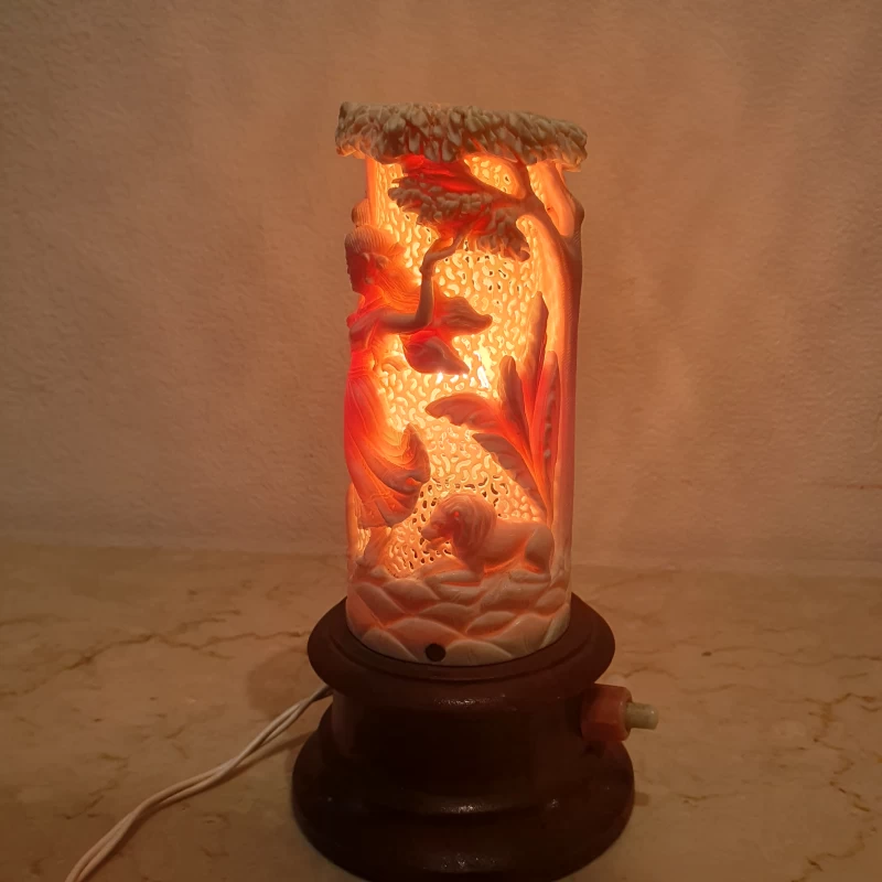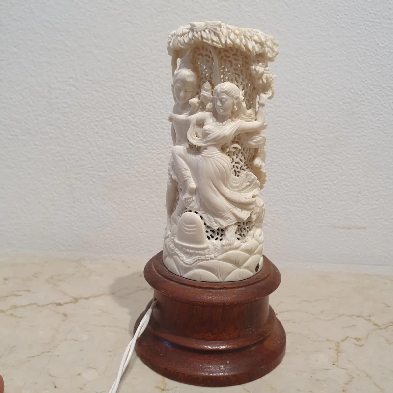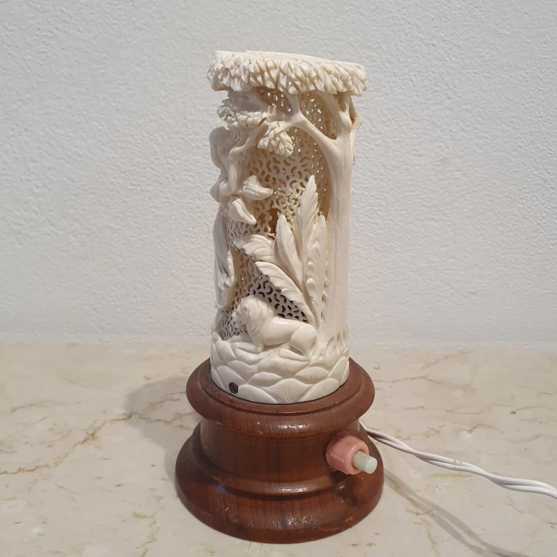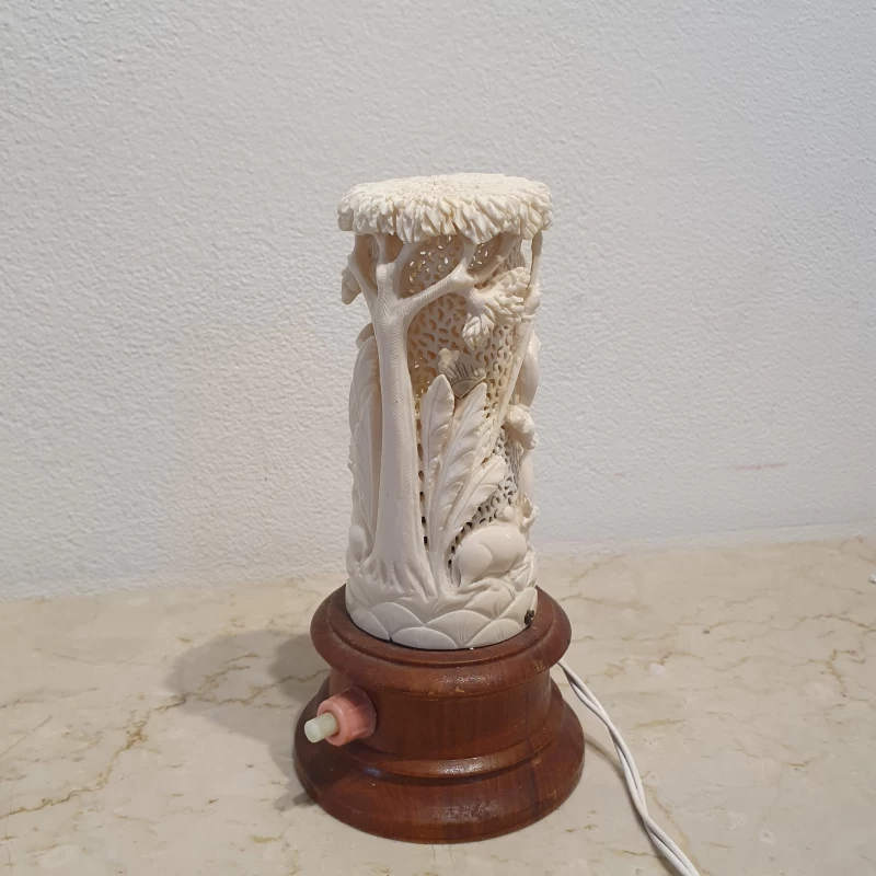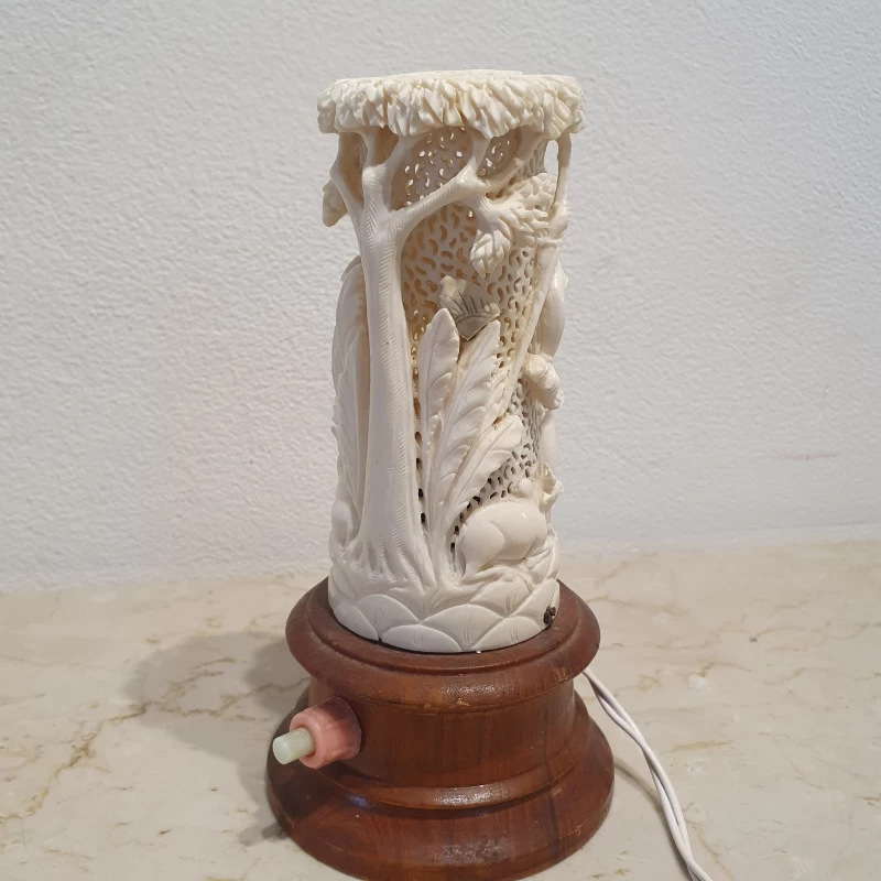 Lampara Antigua De Marfil Tallada a Mano con Base de Madera